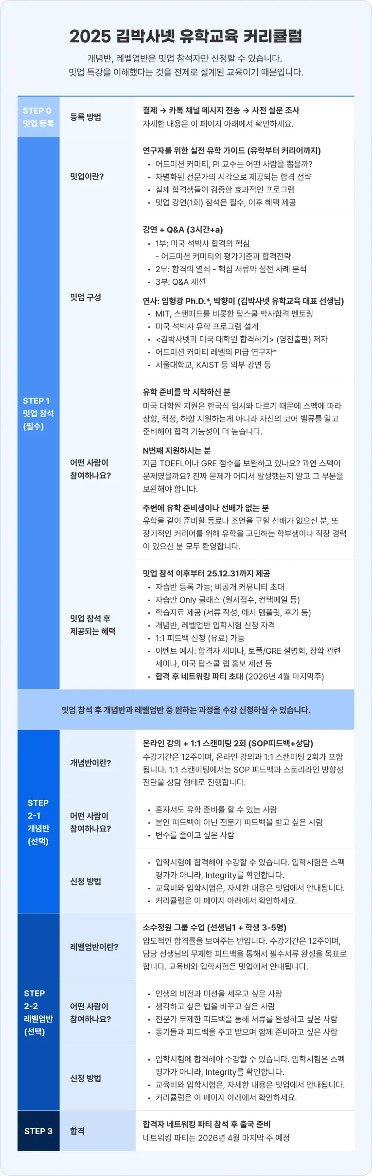 밋업 참석 후에는 제공되는 학습자료와 세미나 참여를 통해 유학 준비를 하면 됩니다. 방향성만 제대로 찾으면 혼자서 준비하고도 합격할 수 있습니다. 만약 전문가의 도움이 필요하다면 개념반, 레벨업반 등 다른 교육 프로그램도 신청할 수 있습니다.