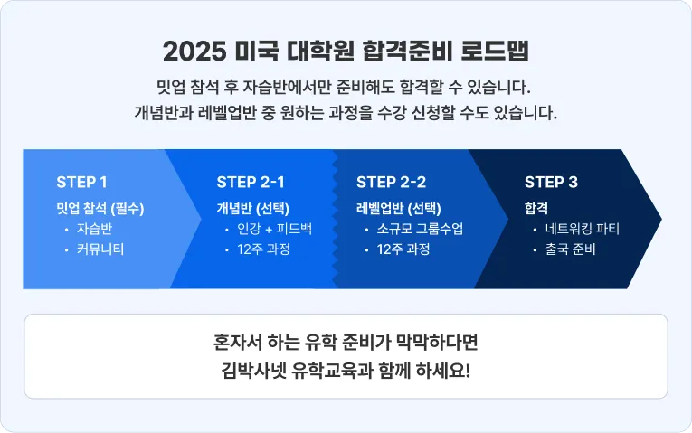 밋업은 김박사넷 유학교육의 미국 대학원 합격준비 로드맵 1단계로, (1) 심층 강연과 (2) 맞춤형 Q&A 세션으로 구성됩니다.